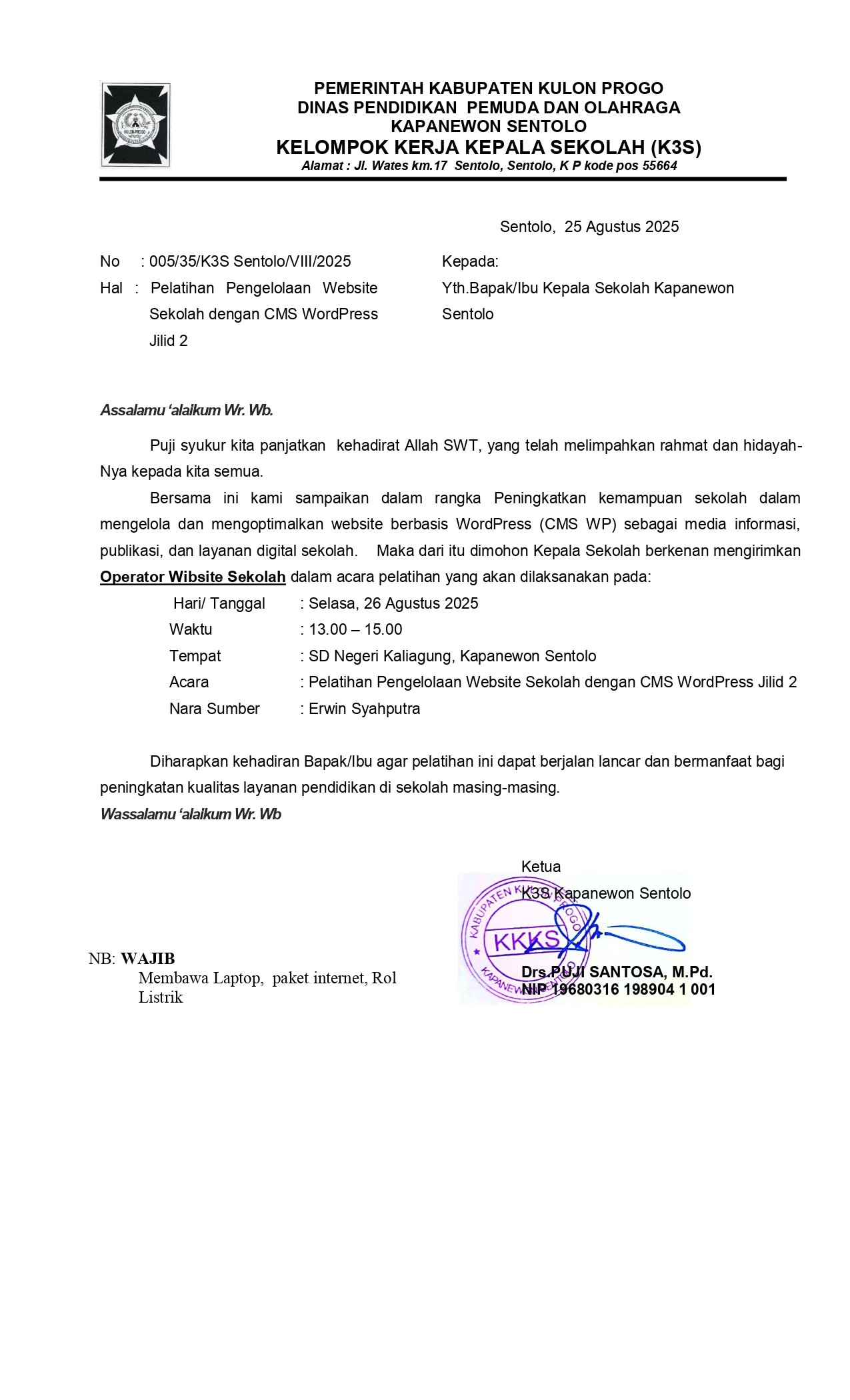 Sentolo – Kelompok Kerja Kepala Sekolah (K3S) Kapanewon Sentolo kembali menyelenggarakan Pelatihan Pengelolaan Website Sekolah dengan CMS WordPress Jilid 2
